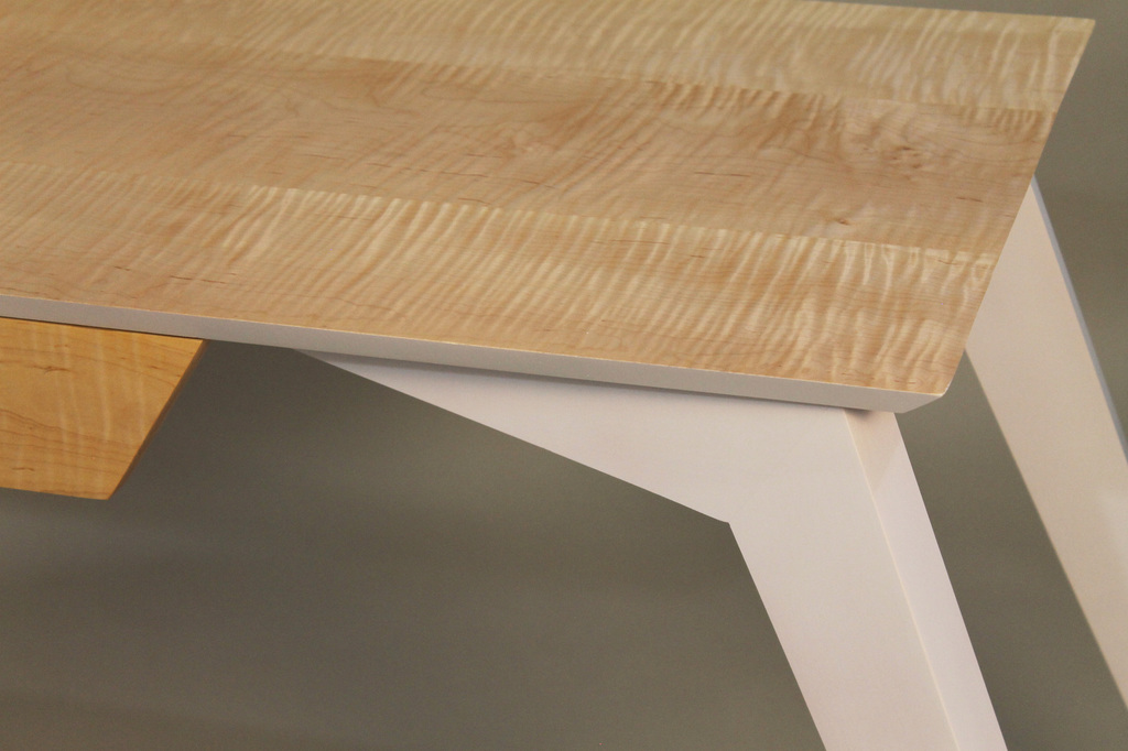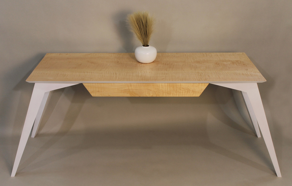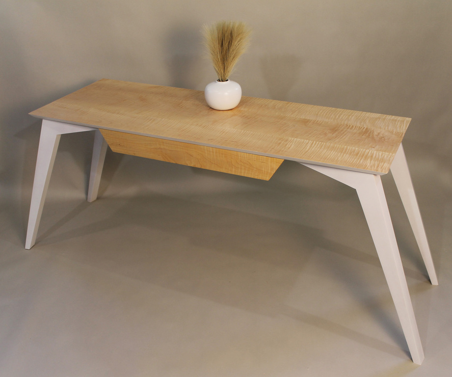 Bianca is a study in straight lines, sharp angles and contrasting colors. The solid Tiger Maple top surface is stunning in its own right, with its incredible figure and chatoyancy that is best appreciated in person. Completing the look are the beautifully angled legs, crafted from solid Maple, giving a sense of motion and harmonizing perfectly with the white beveled underside of the top. Dimensions: Desk: 59” long x 20.5” deep x 28.5” high. Drawer Unit: 17.5” wide x 19” deep x 26” high. Price as shown: $3,500.