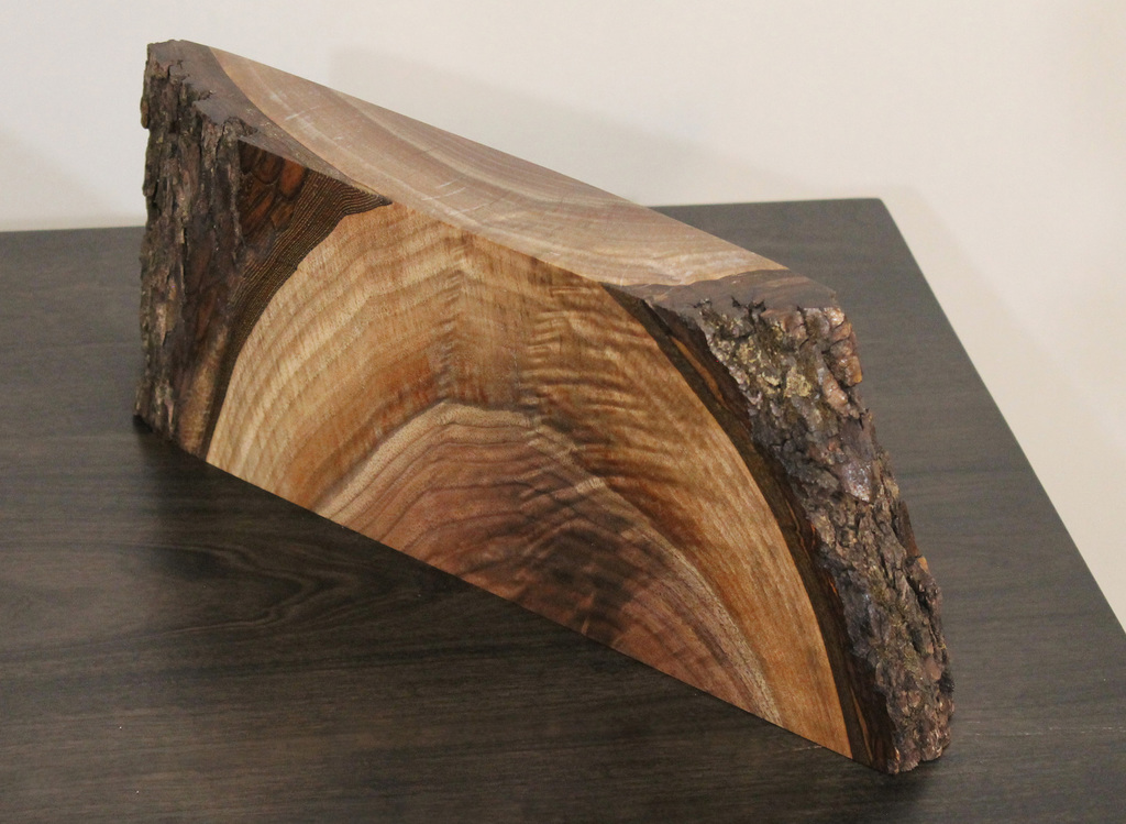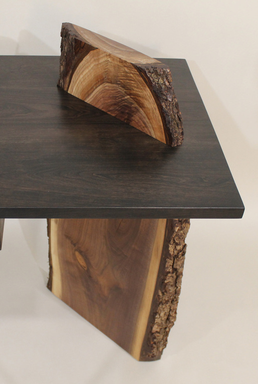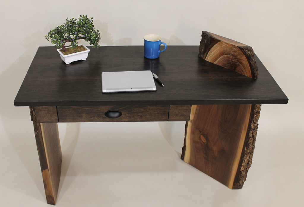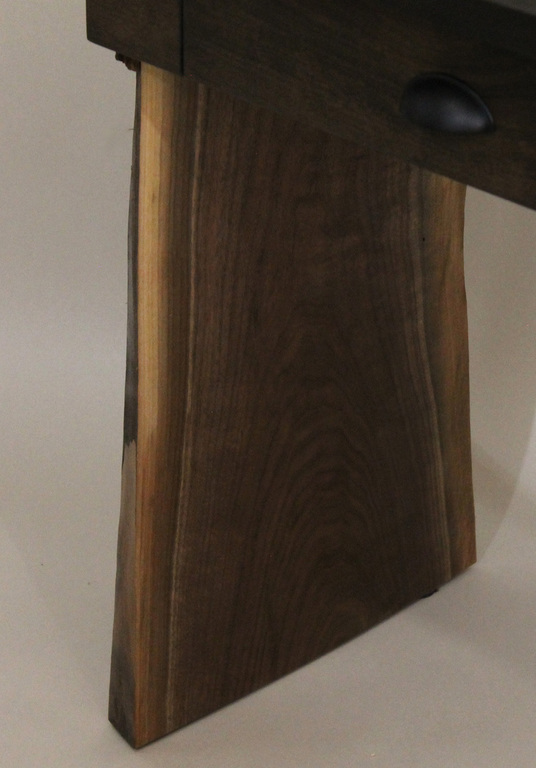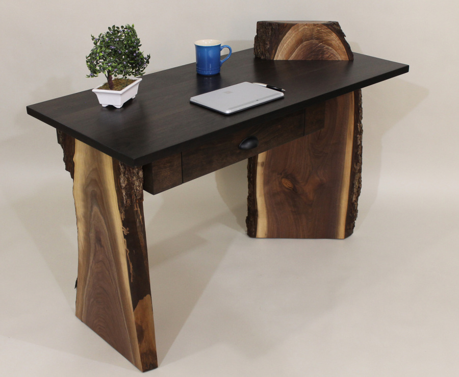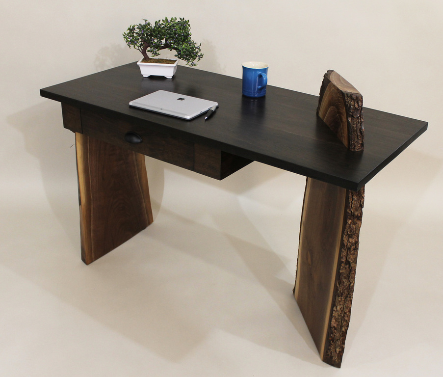 “Leo” (Live Edge Original) is a truly unique writing desk that incorporates two stunning live edge Black Walnut slabs that support the solid Black Cherry top. The right side slab, set at 45 degrees, incorporates my signature design of a “piercing” element that flows through the top. Dimensions: 48”L x 22”D x 30”H. Style meets incredible stability. $2,500 as shwon. (Please be aware that custom commissions of this piece will have significant variations in the appearance of the live edge slabs as no two are ever alike. Please contact me for availability and images).